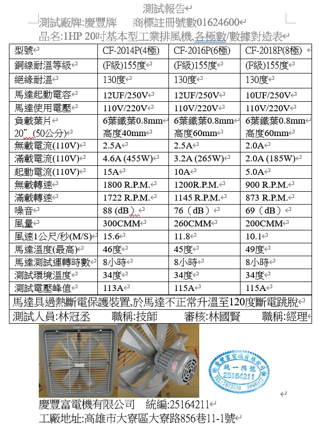 規格介紹:1HP 20吋 單相6極 110/220V【6葉鐵葉 60度】工業排風機 慶豐牌 CF-2016P