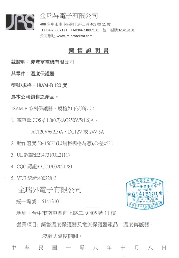 保護裝置:高規過熱斷電保護,回溫續電,120度跳脫